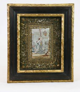 S. Stephanus. M., XVIIIe s. Encre, gouache et or sur peau de vélin, 13 x 8 cm; sertie dans une importante dentelle de fils dorés semée de paillettes, perles et cabochons de verre coloré. Sous verre et cadre mouluré cerné de listels dorés....