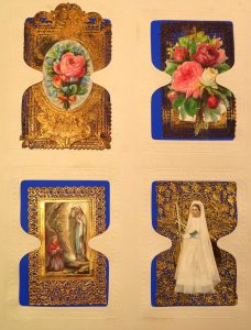 Belle collection d'images, en partie rehaussées à la gouache. Qqs édit. : Bouasse-Lebel, Boumard, Aubry, Turgis, Letaille, Saintin etc. A noter : un canivet avec médaillon central finement gouaché. - +/- 100 images à dentelles (certaines dorées) avec au centre des gravures finement aquarellées. Travail extrêmement soigné. - +/- 15 images décorées d'étoffes précieuses, de découpis métallisés, fleurettes, etc. - +/- 15 images néogothiques avec décors dorés imprimés. Avec aussi qqs pcs sur galalithe, des pcs ill. de petites photogr. originales centrales, nombr. pcs en noir figurant des saints. Qqs pcs plus anciennes par Fruytiers, Craen, de Boudt, Huberti, etc., avec texte ms. ou imprimé au verso (1666, 1790, 1811, 1832, 1838), figurant S. Thérèse, Benoît Labre, S. Ludwina, S. Dominique, etc. Joint : +/- 20 images pieuses volantes dont 6 à dentelles, 3 sur soie, 1 avec fleurs séchées, la majorité avec texte imprimé au verso.