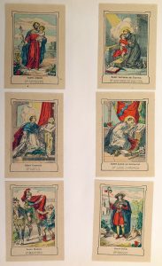 Pièces légendées en français, néerlandais, français/néerlandais, français/allemand, français/italien. Factures très diverses, avec les figures des saints et saintes inscrites dans des médaillons, des ovales, des rectangles, des hexagones, des cadres ornementés, rococo, gothiques, fleuris... Sujets : saints, saintes, scènes de la vie du Christ, images pieuses, etc.