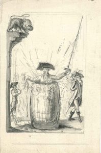 (Orig. ?) sketch for the engraving by Maillart (1764-1856) published in 1788. It shows the (Irish-)Austrian general Richard d’Alton (1732-1790) standing in a barrel filled with shit – a symbol for the hopeless situation of the Austrian army in Brabant, esp. after the Brussels shooting incident of 22 January 1788.