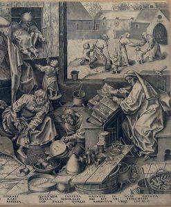 2nd state (of 4) with Cock's address, 3 lines Latin verses and the word "Hospital". Reverse drawing by P. Brueghel in Berlin, dated 1558.