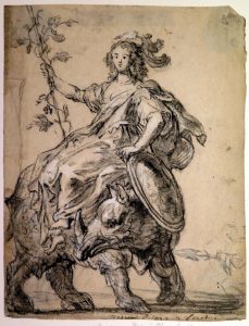 Nice drawing featuring a lady holding a grape twig in the right hand and a shield in the left and sitting on a rhinoceros.