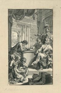 Very nice lavis showing allegorical (?) characters studying with in the front some puttis playing with a globe and in the background bookshelves.