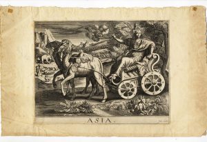 Asia, s.d. Tool engraving, 22 x 27,8 cm (trimmed to the platemark and a little more in lower part); signed. Underlaid, stuck by corners and edges on a laid paper leaf, under passe-partout. Sm. wormhole in upper left part, sm. scratch in lower part.