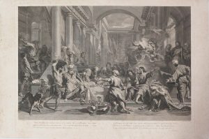 Le repas chez le Pharisien, 1ère moitié XVIIIe s. Burin, 60 x 83,5 cm (grandes marges); noms et légende latin/français dans la marge inf. Fines piq., surtout visibles dans les marges, déchir. rest. dans la marge inf.