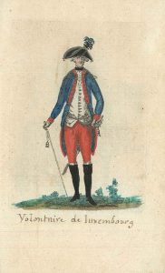 Costumes des volontaires de l'Empire autrichien dans nos régions dont 2 pour Soignies, 4 pour Binche, 2 pour le Namurois, 2 pour Gembloux, 1 pour Luxembourg, 3 pour les "volontaires de Hainaut réunis", 2 pour Nivelles etc. Qqs pl. portent des précisions mss, p.e. "Command.", "Artillerie Comp. de Sanbleaux", "Artillerie Pre. Compagnie" etc. Extr. de l'album "Schema aller Uniform der Kaiserl. Königl. Kriegsvölkern" qui connut plus. éditions entre 1781 et 1794.