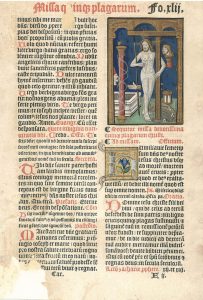 Running title “Missa quinque plagarum”. Decoration: 1. Large orig. coloured woodcut, c. 10,5 x 7,5 cm, with the Resurrection, in blue, green, red, and yellowish brown border. - 2. 6-line initial "H" with a blue and green flower on a gold background.