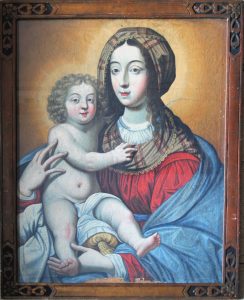 A charming painting showing the Madonna dressed in what seems to be a traditional Italian garment, holding the naked Child. His rather adult looking face is framed by curly fair hair.