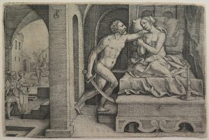 Tarquinius rapes Lucretia, s.d. Engraving, 7,8 x 12 cm (trimmed to the platemark); engr. monogr. Pasted by upper margin under passe-partout. Sm. tear repaired in lower right part.