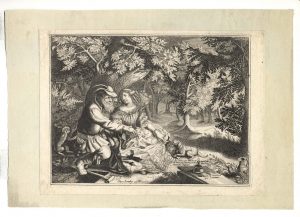 L'amoureux vieillard, s.d. [fin XVIIe s. ?]. Burin et eau-forte, publ. à Paris, chez Landry, 18 x 24 cm (marges inégales); non signé, nom de l'éditeur et courtes légendes gravés dans la pl. Collé par le bord g. sous passe-partout. Coins...