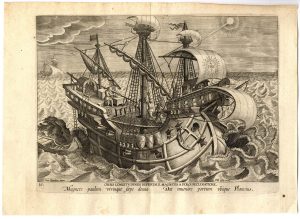 A large sailing ship with a Jesuit flag, navigating the sea; a man seated in the stern of the ship follows the longitude with a magnet. Plate 16 from "Nova reperta", a set of 20 prints illustrating new inventions and discoveries.