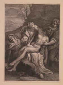 Pieta, s.d. Engraving and etching after Tintoretto, 39,5 x 28,7 cm (trimmed to the platemark); engr. names. Stuck by left margin. Good condition.