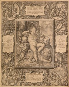 Allegory of human life; at centre a naked child, resting upon a lion and a skull, holds an hour-glass; he points towards the name "Christus" in the sky; surrounded by an emblematical ornamental framework displaying four roundels at each corner with the ages of man and four cartouches at the midpoints. The 4 cartouches extensively lettered with quotations. Title and date in upper cartouche. (British Museum-Coll. on line).