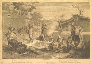 La Moisson. Paris, Daumont, s.d., 33,5 x 48,5 cm (trimmed to the borderline, some marg. staining, sm. marg. hole rep.). Harvesting farmworkers. With underneath French poem. - Divertissements de paysans hollandois. Paris, L. Surugue, 1748, 37 x 47 cm (sl. browning). Later impression ? Farmers fair after a painting of D. Teniers. - Le village pillé par les Pandoures hongrois. Paris, Le Bas, 1746, 30,5 x 41 cm (marg. soiling & staining, folds, sm. hole in caption). Engr. by J. Vanloo. - Charlatans et animaux savans, s.d. Chataigner after Jardin, +/- 32 x 25 cm (foxing).