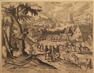 Collaert, I. - Aetas Aenea, 17th c., copper engr. after T. Verhaecht, ed. by P. Galle. Trimmed to platemark. Strong print. - Le Maître gaigne petiet = Slypt Tonge sooje siet. Broadsheet, 17th c. Text  and engr. in 2 separate parts. Fictitious edition place and name "Langres chez Tongelel". - De Wintgot, uytgebuldert hebbende, laat niet dan rampen na, c. 1725, copper engr. Caricature on the "Windhandel" (literally "wind trade"). - Epithalame du Roy Louis XV. Lan 1725. Trimmed to platemark, roughly remargined, stains. - Ay geeft doch wat gehoor (...), engr. Trimmed to borderline. - Stat dubius tremlusque senex (...), engr. Trimmed to borderline, lower corners torn and replaced by chip of paper.