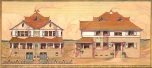 Façades avant et arrière de 2 villas accolées conçues par Paul Cauchie (1875-1952) et Edouard Frankinet (1877-1937), construites en 1914 à Duinbergen. L'une des 2 maisons fut utilisée par Cauchie et sa famille comme résidence de vacances. Malgré qqs altérations (diminution des terrains, quasi disparition des sgraffites...) dues à l'évolution normale d'une cité balnéaire, à la guerre..., ces villas subsistent sous les noms "La Nuova" et La Bella" et ont été classées ("erfgoed") en 2003. Elles apparaissent ici dans toute leur fraîcheur. Originaire de Ath, Paul Cauchie est davantage connu comme décorateur et concepteur de sgraffites Art Nouveau que comme architecte (il ne réalisa que 5 habitations dont la sienne, la fameuse maison Cauchie située rue des Francs à Bruxelles, et la villa jumelle susmentionnée à Duinbergen).