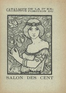 Catalogue de la 17e exposition du Salon des Cent, 1895. Couverture illustrée, clichée, Paris, Davy, 11,9 x 9 cm, vélin rose 19,5 x 14,5 cm; signée dans la pl. Bon ex. Pour la publication éponyme, in-12, br. (non coupée). Catalogue imprimé sur...