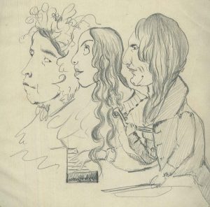 Recueil de 60 caricatures, XIXe s. Dessins aux divers crayons noirs sauf 1 aquarelle, certains avec rehauts d'aquarelle ou de gouache blanche, formats divers; non signés, un daté 1861, 1 autre 2/7/1865, 1 autre décembre 1873, pour la plupart...