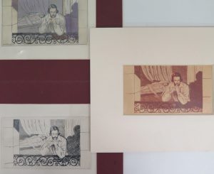4 dessins préparatoires et 5 eaux-fortes dont 3 en plusieurs épreuves pour illustrer "Rolla" d'Alfred de Musset, s.l., s.n., c. 1950. Formats et papiers divers. Montés par les bords sous passe-partout. Bon ensemble.