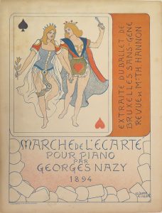 Très rare partition chromolith. figurant un roi de coeur et une dame de pique fantaisistes, témoignant de la collaboration des peintres et affichistes belges A. Crespin (1859-1944) et E. Duyck (1856-1897). La réalisation cosignée la plus connue de ces 2 pionniers de l'affiche illustrée en Belgique reste la célébrissime affiche figurant l'architecte Paul Hankar au travail.