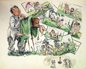 Ill. en noir sur le plat sup. de la couv. de papier ocre, titre comme supra, 1 f. de justif. in fine et 20 lithos, toutes rehaussées et comportant une remarque marginale. Tirage à 125 ex. num. Un des 115 sur Rives (n. 17). Ex. enrichi de 2 aquarelles sur crayonné originales libres, non signées. Cet album connut 2 tirages, l'un à 200 ex. publié à Bruxelles et le nôtre à 125 ex. Pour ces 2 tirages parus la même année, Dutel ne mentionne que 16 pl. en couleurs, contre 20 dans notre ex. Truculentes planches, parfois très acrobatiques.