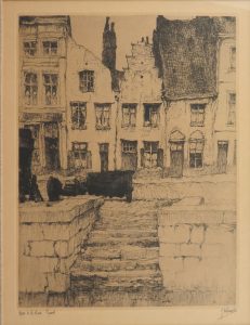 "Quai de la Lieve Gand", [1920]. Eau-forte, 31,7 x 23,5 cm, japon 35 x 26,5 cm à vue; signée et titrée à la mine de plomb. Sous passe-partout, verre et cadre (non désencadrée) = Ets, Japans papier; in potlood gesign. en getit. Ingelijst (niet...