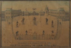 "Vue, du - chateau, de - Ve[r]sailles, côté - de - Paris./ Verliette - ouvrier, tailleur, de - pierre, 1843./ Fiet (!) a, Beilleville (!), le 19 decembre, par - Verliette". Aquarelle et collage, vergé teinté 30 x 44,5 cm à vue; signée et...