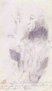Feuille d'un carnet de croquis figurant l'artiste de profil tourné vers la g., avec d'autres légères esquisses disséminées dans les parties g. et inf. Offerte par Khnopff à l'architecte anversois Jean-Jacques Winders avec mention autogr. par ce dernier : "Portrait de Juliaan de Vriedt, esquissé en une séance de l'Académie royale de Belgique par le peintre Fernand Khnoph (!) - & offert à J.J.W." Fernand Khnopff (1858-1921), Juliaan De Vriendt (1842-1935) et Jean-Jacques Winders (1849-1936) étaient tous trois membres de l'Académie royale des Sciences, des Lettres et des Arts de Belgique. Delevoy, De Croës et Ollinger-Zinque répertorient un croquis similaire de De Vriedt par Khnopff portant également une mention d'appartenance de la main de Winders, celui-ci daté du 6/11/1913.