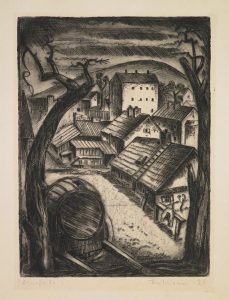 [Village in the mountain], 1926. Etching, 21 x 15,5 cm, vellum paper 30,2 x 23,4 cm; signature, date and note "Akwaforta" in pencil. Stuck by left margin. Sl. browning.