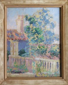 [Coin de jardin], s.d. Peinture à l'huile sur papier monté sur panneau de bois, 28,7 x 22,2 cm; signée "Le Sidaner" (sign. autographe ?) au pinceau dans le coin inf. g. Sous cadre doré.