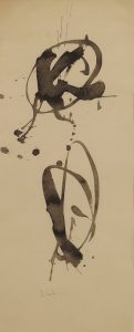 [Signes 81, c. 1970]. Calligraphie, pinceau et encre de Chine, très fin papier ou chine 61,5 x 24,5 cm à vue; signée dans la partie centrale inf., titre au verso du cadre. Sous passe-partout, verre et cadre (non désencadrée).