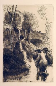 Vachère au bord de l'eau, 1890. Eau-forte, 19,5 x 13 cm, vergé à moyennes marges in-8. Avec la serpente titrée de la "Gazette des Beaux-Arts". - SISLEY, Alfred - Bords du Loing, la charrette, 1890. Eau-forte, 14,5 x 22,3 cm, vergé crème à...