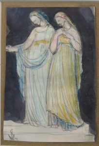 Deux figures féminines, s.d. Technique mixte, 11 x 7,5 cm; monogr. dans le coin inf. g. Sous passe-partout, verre et cadre (non désencadrée).