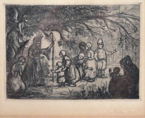 Het kerstverhaal, s.d. Ets, 12 x 16,5 cm, velijn papier 15 x 18,3 cm zichtbaar gedeelte; met stempel gesign. in rechterbeneden arge (vervaagde inkt). Ingelijst onder passe-partout (niet uitgelijst). L. gebruind incl. passe-partout.