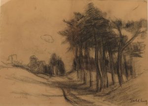 [Kempisch landschap], s.d. Houtskooltekening, velijn papier 23,5 x 33 cm; met potlood gesign. in rechterbenedenhoek, met stempel gesign. in de linkerbenedenhoek. Ingelijst onder passe-partout (niet uitgelijst). Min. roestvlekjes, scheurtje in...