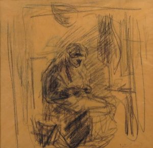 [Oude vrouw in interieur], s.d. Houtskooltekening, getint velijn papier, 19 x 19,5 cm zichtbaar gedeelte; met stempel gesign. Ingelijst onder passe-partout (niet uitgelijst).