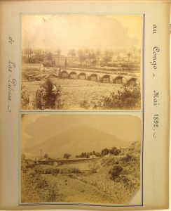 Album réalisé par un Belge non identifié (F. Kinnen ?), actif dans le domaine de l'établissement de lignes de chemin de fer à l'étranger, à l'occasion de ses séjours en Afrique (Congo, Mozambique) et en Chine, avec passage aux Canaries (Las Palmas) et en Egypte (Port-Saïd). Las Palmas, 1892, en route vers le Congo, 11 pcs : vues du port, de la ville, du chemin de fer, de la cathédrale, du Palais du gouvernement... Congo, Matadi, 1893-1904, 13 pcs : parc et gare du chemin de fer, factorerie des produits végétaux, pont sur le ravin de la chute (avec locomotive), divers groupes d'amis dont Kinnen, le commandant Weyns (i.e. Auguste-François-Guillaume Weyns, 1854-1944), un "groupe d'employés et ouvriers du chemin de fer à Matadi, 1894", l'arrivée de la 1ère locomotive à Toumba en sept. 1904... Port-Saïd, s.d., 3 pcs dont 2 signées Peridio & Georgiladakis dans le négatif : vue générale de Port-Saïd, bateaux hollandais croisant le pont des caravanes de Kantara... Chine, 1902, 53 pcs : 2 portraits d'Eugène Slosse (1866-1940, ingénieur en charge de la Compagnie du chemin de fer Pékin-Hankow), intérieur d'habitation d'Européens à Hankow, scènes de la fête du dragon dans un village, groupe de mandarins, rue à Shanghaï, groupe de Japonaises à Hankow en juillet 1902 avec Kinnen et Pirotte, plus. vues dont 1 panoramique des montages de loess près du fleuve Jaune, ponts métalliques, vue du fleuve Jaune, "passage du fleuve Jaune par Mr Jadot" (i.e. l'ingénieur Jean Jadot, 1862-1932), "wagon de service pour les employés de la pose du rail"... Mozambique, 1906-1907, 23 pcs : "construction du bureau du campement le 3-12-06. Mr Kinnen dirigeant les travaux", Lacerdonia, "poste fortifié sur le haut Zambèze", avec Kinnen et Fontainas (i.e. l'ingénieur Paul Fontainas, 1881-1964), port de Chindé, léopards, baobabs, "bijoutiers ambulants nègres confectionnant des bijoux dans un village indigène", portrait de Kinnen... L'album s'ouvre sur 13 photos prises à Dohan (Luxembourg belge) en 1897 (groupes d'amis dont Kinnen, le commandant Weyns, etc.) et se ferme sur 1 photo prise à Lisbonne (course de taureaux). Vu l'omniprésence de Kinnen sur les photos, il est probable que cet album a été réalisé par lui.