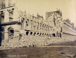 Composition de l'album : Tuileries pavillon de l'Horloge, Hôtel de ville (2), Cour des comptes, [Colonne Vendôme écroulée], peu lisible, Arsenal, Ministère des Finances, Palais royal, Palais de justice, Grenier d'abondance, Docks de la Villette, Place de la Bastille, peu lisible, Porte St Cloud, Colonne de Juillet, Théâtre de la Porte St-Martin, St Cloud, Rue de Lille et Fort d'Issy.