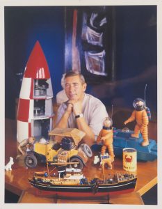 Hergé entouré de maquettes et figurines évoquant les albums de Tintin, 1964. Photogr. orig. en couleurs tirée sur Cibachrome, 30,9 x 23,8 cm, support 33,1 x 26,5 cm; signée avec mention de copyright, just. "EA" et num. 10/10 au verso.