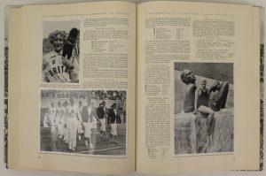 Joined : Die Olympischen Spiele in Los Angeles 1932. Altona-Bahrenfeld, Reemtsma, 1932, 4to, orig. publisher’s blue cloth (sl. soiled, no wr.) with front cover titled and gilt, 142-[2] pp., folding coloured table. Very good copy. Rare German memorial vol. of the Olympic Games of Los Angeles. With 196 b/w & colour photographs pasted in. (2 vol.)