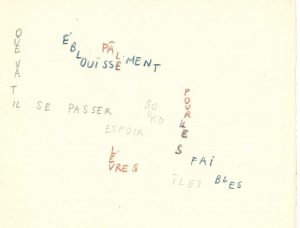 17 jeux de mots aux crayons noir, rouge et bleu, sur 17 ff., 15 x 19 cm. Conservés sous couv. cartonnée d'un ancien cahier de brouillon. Mots et sentences sont disposés sur la page à la manière des essais typographiques Dada ou futuristes. Carnets inégalement remplis (les dessins sont parfois disséminés à travers de nombr. pp. blanches), contenant des dessins aux crayons noir, rouge ou bleu ou à l'encre de Chine (peu), un seul rehaussé à l'aquarelle. Facture très inégale, certains franchement enfantins, d'autres atteignant un stade plus évolué. Sujets : portraits (non identifiés), scènes (femmes lisant, cousant, jouant du piano...). Certains présentent sur le même f. un sujet relativement classique à côté d'une tentative de géométrisation du même sujet.