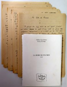 Joint : 2 photocopies du ms. (sans les pp. 5, mais avec la p. 55). - Périer, Odilon-Jean - La robe de plumes. [Ill. par Petrus De Man]. (Bruxelles), La Pierre d'Alun, (2005), pet. in-8, en ff. sous couv. impr. Tirage à 600 ex. num. + qqs s.p.