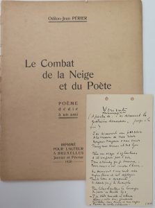Edition originale très rare du 1er recueil de l'auteur, tirée à 100 ex. Ex. de passe contenant une variante aut. de la fin du poème sur 1 f. volant, in-12 : "(A partir de "J'ai découvert la quatrième dimension" jusqu'à la fin)// J'ai découvert un paradis/ A la mesure de mes rires/ Bonjour bonjour o mes amis/ Prenez mes armes et la lyre (...)// J'ai bâti ma ville en silence :/ Allons y vivre avec prudence/ Mes soeurs, mes âmes et mes anges/ Passons les portes d'Eleusis".