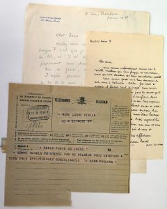 Joint : Enveloppe aut. vide à Jean Paulhan, jamais expédiée. - Paulhan, Jean - Sign. aut. sur une lettre de condoléances à Laure Périer, de la main de sa compagne Germaine Pascal, Paris, 26/2/1928, 1 p. sur 1 f., in-12. - Id. - Télégramme de condoléances, 23/2/1928. (4 pcs)