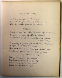 Copie soigneuse, sans rature, de qqs poèmes, peut-être pour un ami, comme le poète avait coutume de le faire. Certains textes ont été publiés, les autres sont inédits, n'ont pas été repris dans les édit. de 1952 et 1979 ou ont été publiés dans une des nombreuses revues auxquelles le poète collabora. Soit : "Un jeune homme/ Qu'avez vous fait de mon amour (...) O mes hommes vainqueurs, mes hommes à genoux", "La chambre du poète/ Je t'offre un verre d'eau glacée (...) et reste pris" (paru dans "Le citadin", dans une version différente, ici avec 3 strophes en plus), "Rouge de honte et de plaisir (...) Au démon qui dicte ces vers" (paru dans "Le promeneur" sous le titre "Tremblant de honte et de plaisir" avec une autre variante), "Pour veiller ce soir d'hiver (...) Il faut compter avec Dieu" (paru dans "Le promeneur" avec une variante), "Pièce à grand spectacle/ Une roue énorme (...) Les grands jardins tristes de la banlieue"), "J'ouvre les bras parmi un tourbillon de feuilles (...) Mourir est neuf/Est confortable", "Que les femmes sont belles ce soir (...) Referme ses portes de fer", "Miroir trouble des villes (...) Qui a plongé les mains dans le corps de ton Dieu", "Aventure ou Le chercheur d'or/ Les oiseaux de la pluie aux vitres (...) Et tu avais couché dedans" (publié avec variantes par M. Defrenne, p. 427), "Le boulevard ouvrait des profondes maisons (...) Mes jours sont réguliers et purs comme des palmes", "J'ai bu de l'eau, c'est admirable (...) Ses mains pures de paysan", "Les fiançailles du poëte/ J'achève une journée humaine et raisonnable (...) Mes arbres, mes oiseaux faciles à nourrir".