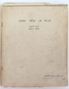 "Notre mère la ville. Poëme 1921-1922". Manuscrit aut.s., resigné et daté "A Bruxelles et en Flandre Décembre 1920-Mars 1922" sur la dern. p., [2]-41 pp. + 1 f. non paginé, sans le f. 40, cahier de papier quadrillé in-8 + qqs ff. volants. Sous...