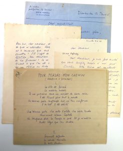 "Pour perdre mon chemin (chansons à promener)". Manuscrit aut.s. et daté "mars-avril 1924", 2 pp. sur 2 ff., in-folio. Pliés. 5 poèmes publiés dans "Sélection" en 1924 : "La ville est fermée", "Sommeil défendu", "Les fontaines ornées...