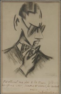 Dessin original : autoportrait à la pipe, 1925, mine de plomb, 10,5 x 9,5 cm; monogr. et daté dans la partie inf. (bruniss., bords repliés). Cet autoportrait a servi de modèle à la gravure sur bois par G. Aubert, cf. infra. - Photo originale : Odilon-Jean et son frère Gilbert adolescents dans un intérieur bourgeois, 15,5 x 11,5 cm. Contrecollée. - Id. : les mêmes un peu plus âgés, Odilon-Jean avec lunettes et pipe, 16 x 22 cm (traces de montage au verso). - Id. : le poète assis à une table dans un parc, probablement lors d'une de ses cures dans le Midi, 6 x 7 cm. Contrecollée. - Id. : le poète à Nice en 1926 (selon une note), 8 x 13 cm. Sous verre et cadre. - Id. : autoportrait caricatural cliché figurant O.-J. Périer de profil à dr., fumant la pipe, dédic. aut.s. à son frère Gilbert, datée 23/11/1921. Sous verre et cadre. - Photo (retirage) : O.-J. Périer de profil à g., fumant la pipe. - Gravure sur bois : autoportrait gravé par G. Aubert, japon 21,5 x 16 cm; monogr. et datée 1925 dans le bois, signée par Périer et just. "F/O" à la mine de plomb. Sous verre et cadre. Epreuve tirée à part du frontisp. de "Le promeneur", Paris, N.R.F, 1927.