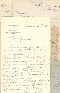 E. Lambotte-Protin (1878-1963) peintre et auteur, née dans une famille d'imprimeurs. "Lambotte appartient à cette génération de femmes qui durant la 2e moitié du XIXe siècle assisteront à l'émergence d'un enseignement féminin laïc et libéral (...) elle mène une vie culturelle et mondaine extrêmement riche et reçoit scientifiques, amateurs d'art, artistes, écrivains, etc." (Écrit(ure)s de peintres belges). Avec e.a. des lettres de Th. Vincent (expert-comptable) entre 1922-1927, la féministe belge Marie Popelin, l'écrivaine France Adine (ps. Cécile Vandromme), 10/03/1945, Benjamin Mather Woodbridge, 5/03/1935, l'artiste Marie Howet (expressioniste belge, texte incomplet), la duchesse de Rohan, 10/03/1923, etc.
