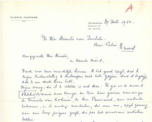 Interessante brief van kunstenaar Floris Jespers aan de toenmalige minister van Justitie Albert Lilar. Jespers vraagt aan Lilar om hem in contact te brengen met de toenmalige minister van Koloniën Buisseret en zo een subsidie te bekomen om zijn reis naar Kongo te financieren.